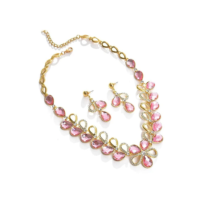 Sohi Women's Pink Stone Teardrop Necklace And Earrings (Set Of 2