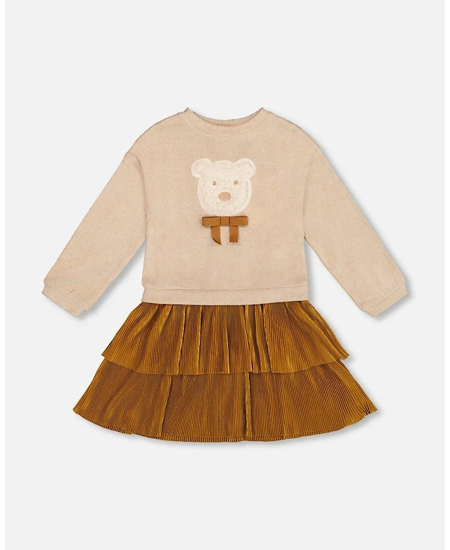 Deux par Girl Knitted Dress Sage Green with Ruffles and Floral Embroidery - Child