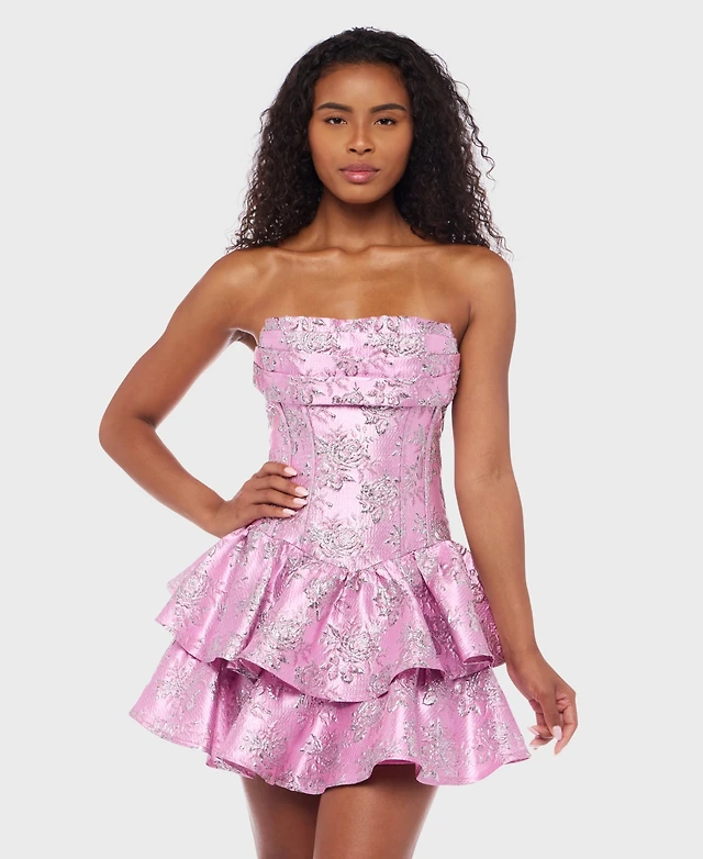 Seni & Cade Juniors' Sequin Embellished Strapless Satin Tiered Dress