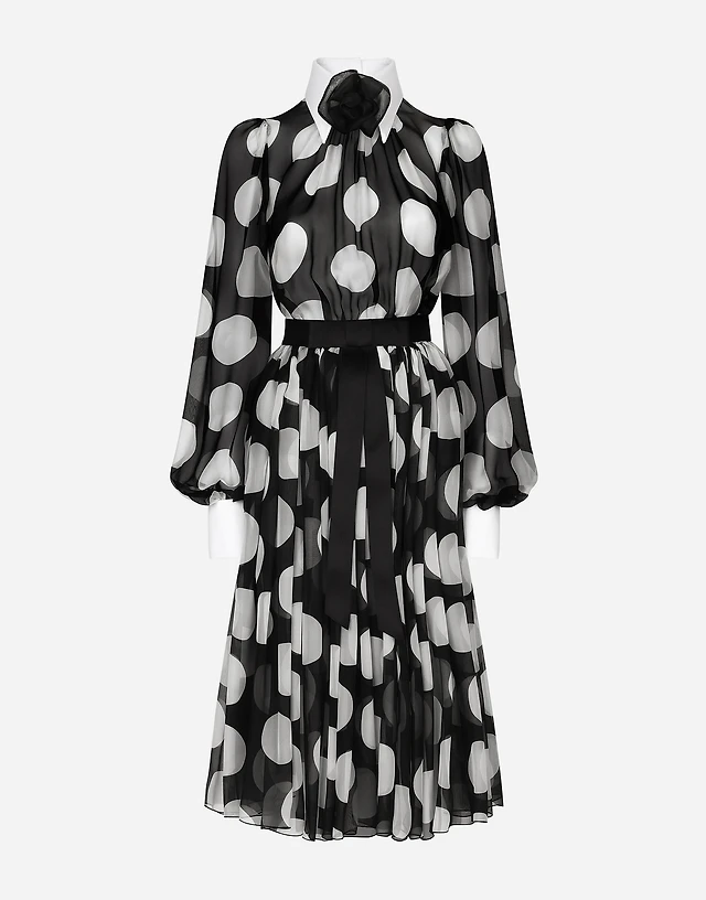 Polka-dot chiffon calf-length dress with piqué details