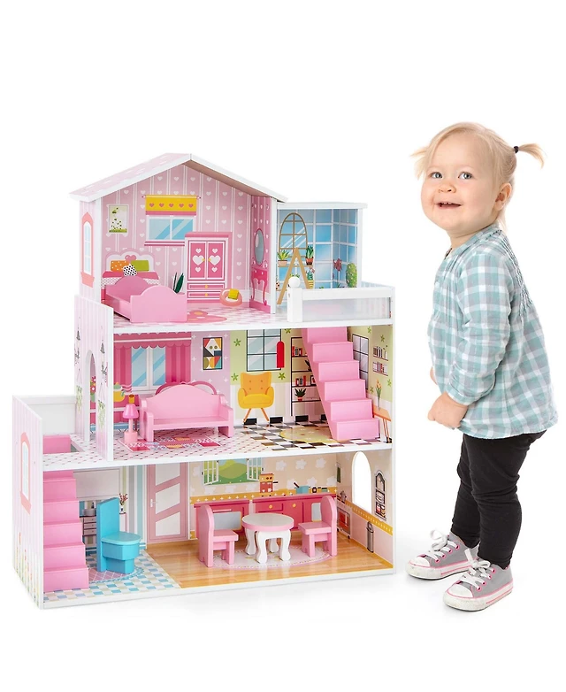 Hongge Wooden Corner Dollhouse Playset with 6 Rooms and 36 Pieces for Kids 3+ Years Old