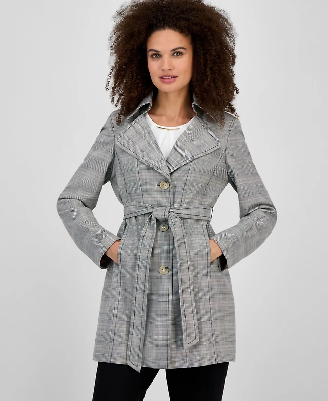 Kasper Plaid Belted Trench Coat, Regular & Petite