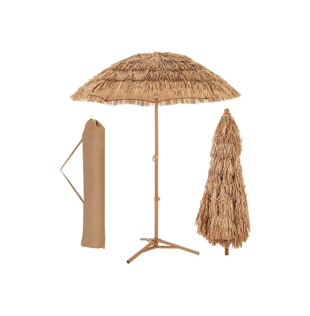 6.5 Feet Thatched Tiki Umbrella with Foldable Stand Push Button Tilt