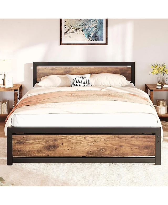Industrial Metal Platform Bed – Wood Headboard and Footboard with Slat Support, No Box Spring Required