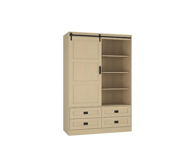 Casainc Tall Cabinet Wardrobe Closet Clothing with Hanging Rod Barn Door Drawers Open Shelves
