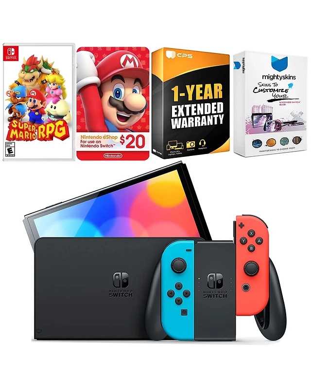 Nintendo Switch Neon Oled with Super Mario Rpg, Gaming Kit, MightySkins Voucher and 2 Year Cps Extended Warranty