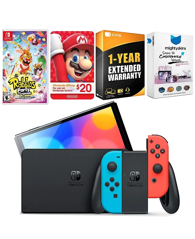 Nintendo Switch White Oled Console with Rabbids: Party of Legends, Surge Accessory Gaming Kit, MightySkins Console and Controller Skin Voucher, and 2