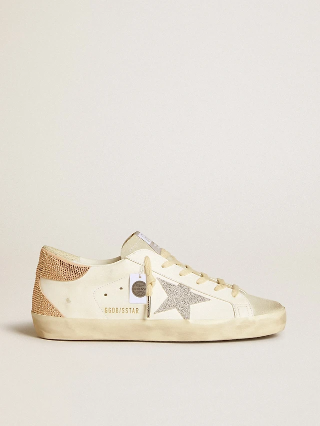 Women's white leather Super-Star with glittery heel tab