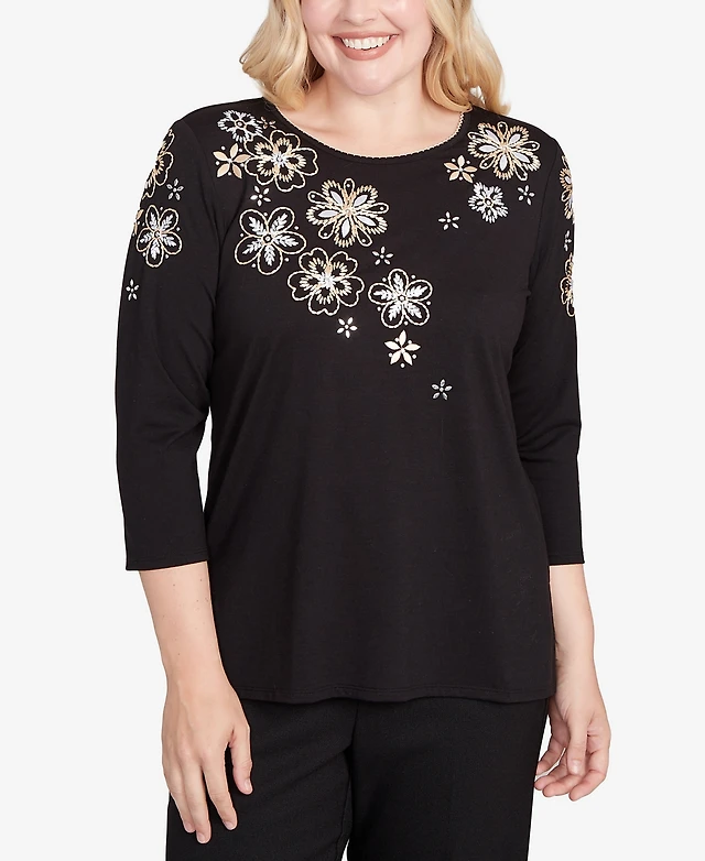 Alfred Dunner Women's Gold Floral Embroidered Three Quarter Sleeve Top