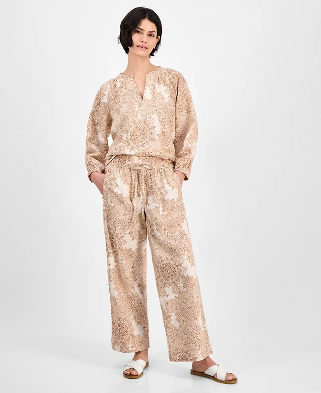 Nautica Jeans Women's Tile-Print Linen-Blend Wide-Leg Pants