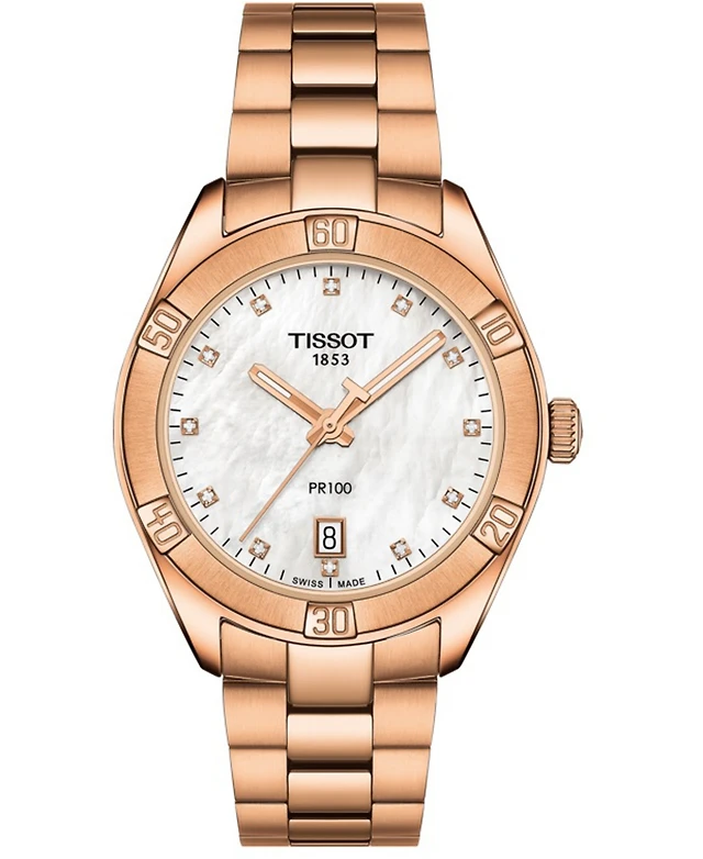 Tissot Women's Swiss Pr 100 Sport Chic T-Classic Diamond (1/20 ct. t.w.) Rose Gold-Tone Stainless Steel Bracelet Watch 36mm