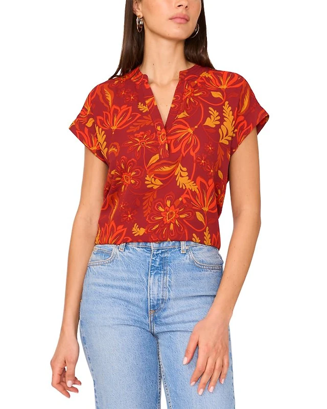 CeCe Women's Floral Bow-Tie V-Neck Button-Up Long Cuff-Sleeve Blouse