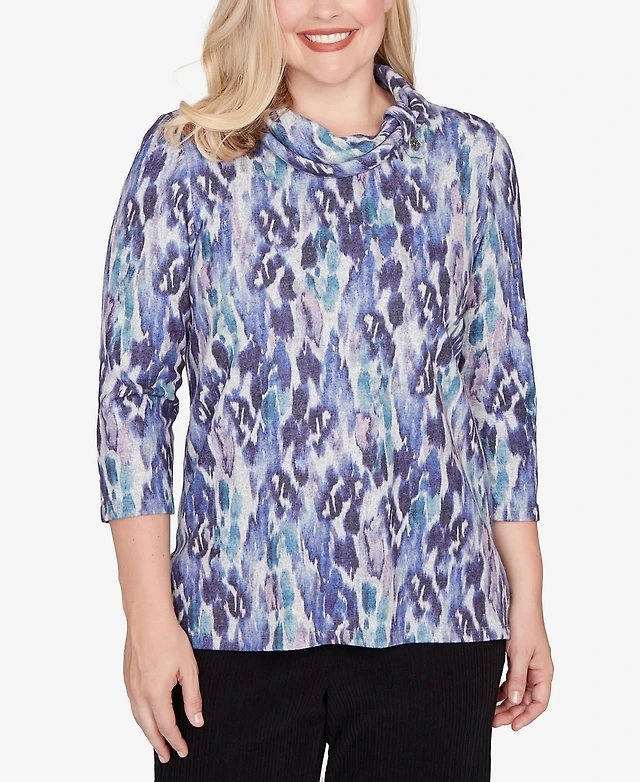 Alfred Dunner Women's Urban Legend Watercolor Biadere Beaded Split Neck Top