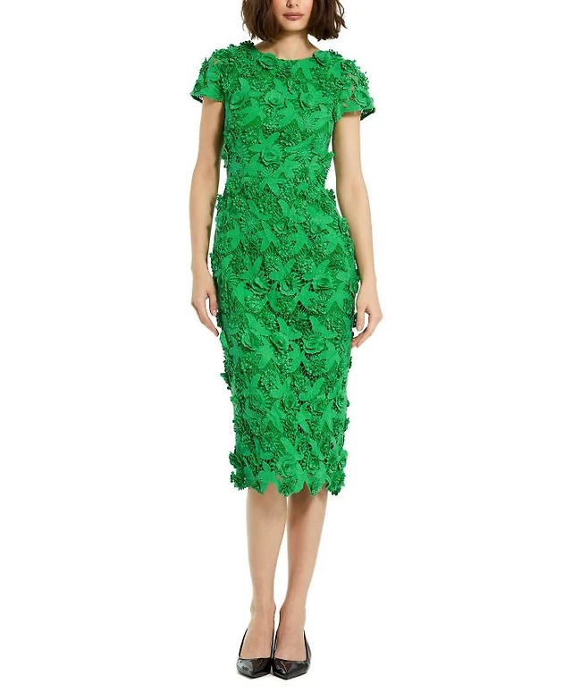 Mac Duggal Women's Puff Sleeve Boucle Midi Dress With Beaded Belt