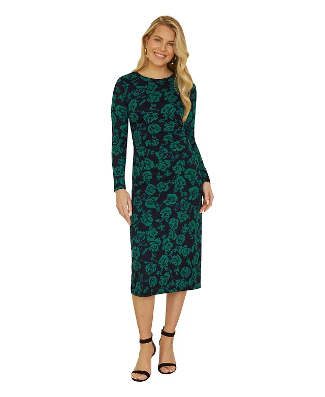 Miss Circle Women's Jacinda Green Floral Print Ruched Breast Linen Midi Dress