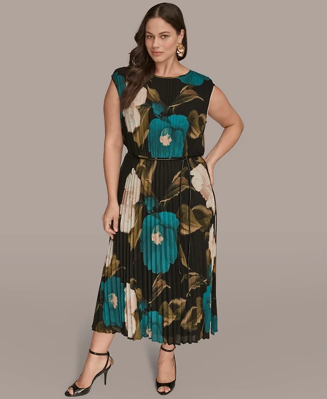 Connected Plus Printed Blouson-Sleeve Faux-Wrap Midi Dress