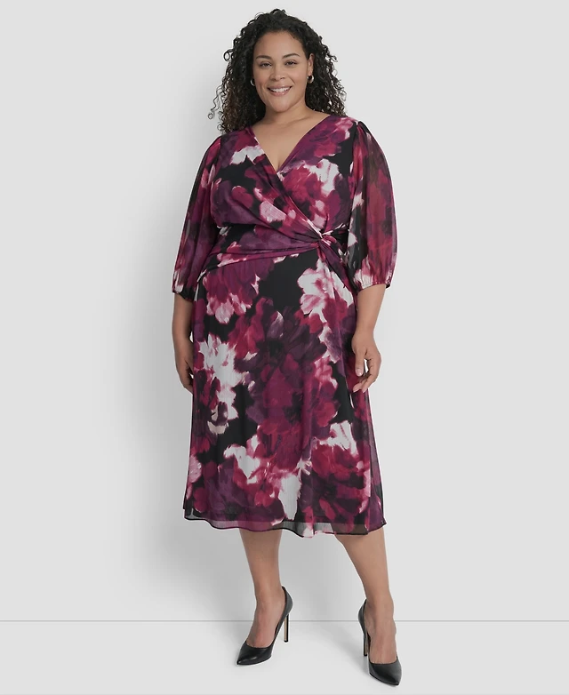 Dkny Plus Bubble Sleeve Surplice Neck Front Knot Midi Dress