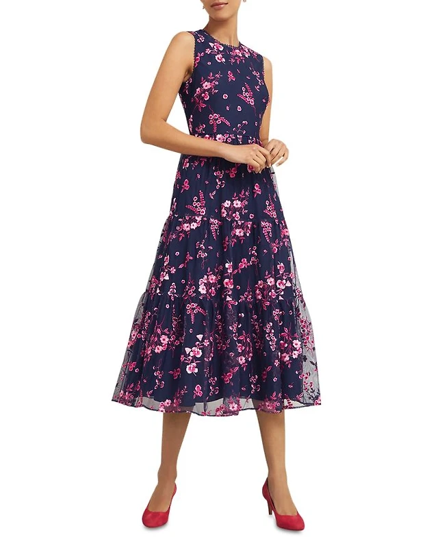 Floral Embellished V-Neck Midi Dress with Shoulder Bow