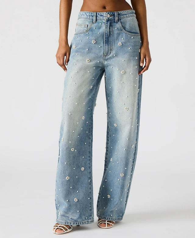 Steve Madden Womens Embellished Denim Fiorella Peplum Top Fianna Barrel Leg Jeans