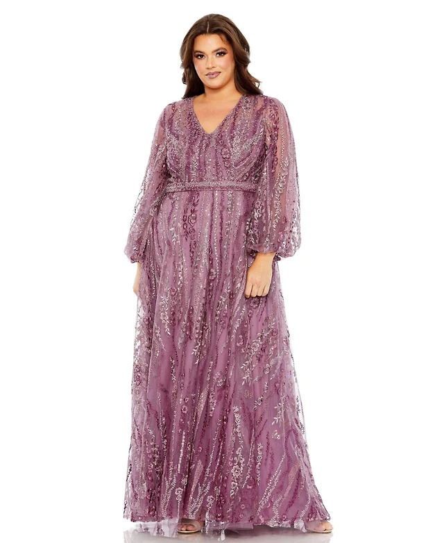 Mac Duggal Women's V-Neck Embellished Long Flutter Sleeve Tired Gown