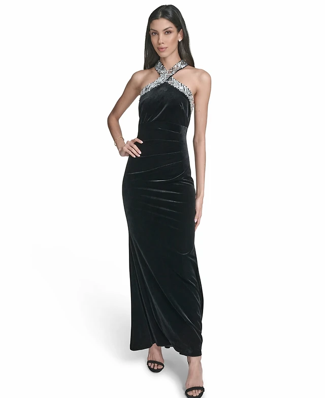 B&A By Betsy and Adam Ruched Velvet Halter Neck Dress