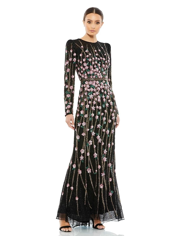 Mac Duggal Women's Floral Embellished Mesh Gown with High Neck & Sheer Long Sleeves