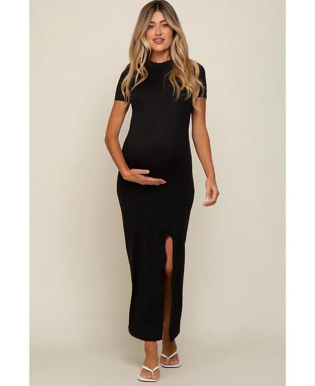 Pinkblush Black Mock Neck Front Slit Short Sleeve Maternity Maxi Dress