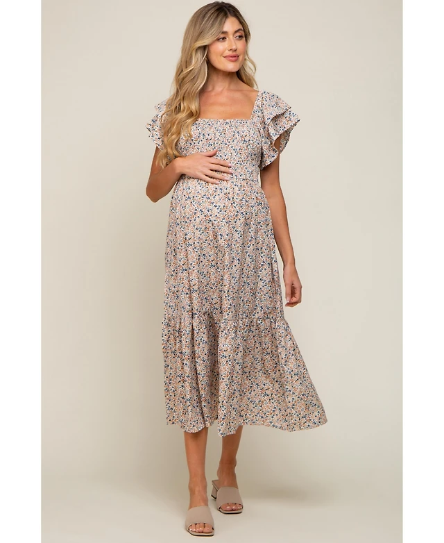 Pinkblush Maternity Ivory Deep V-Neck Flutter Sleeve Tiered Midi Dress