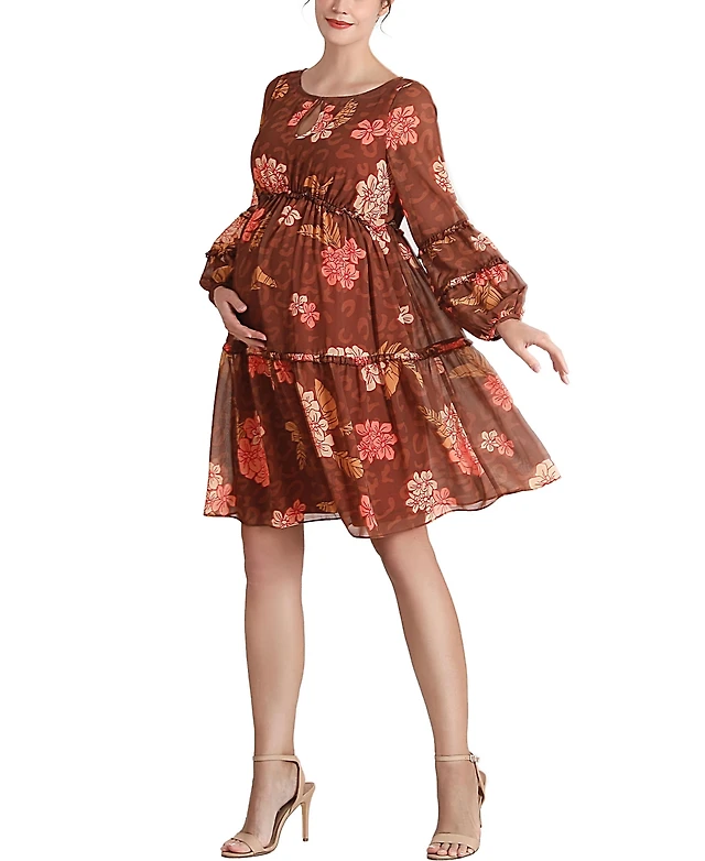 24seven Comfort Apparel Maternity Long Sleeve Midi Dress Brown Floral Print