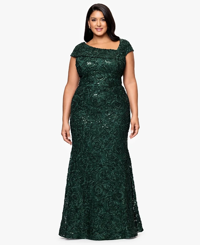 Xscape Plus 3D Floral-Sleeve Off-The-Shoulder Dress