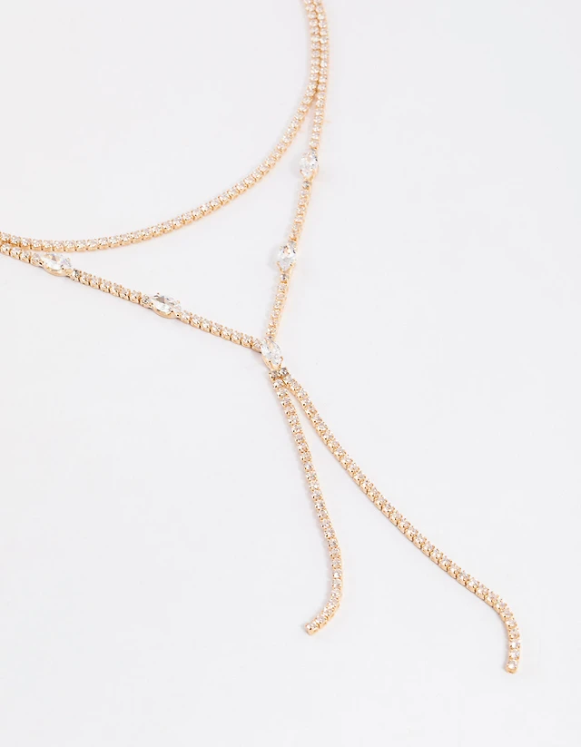 Gold Cubic Zirconia Double Row Split Y-Shaped Necklace