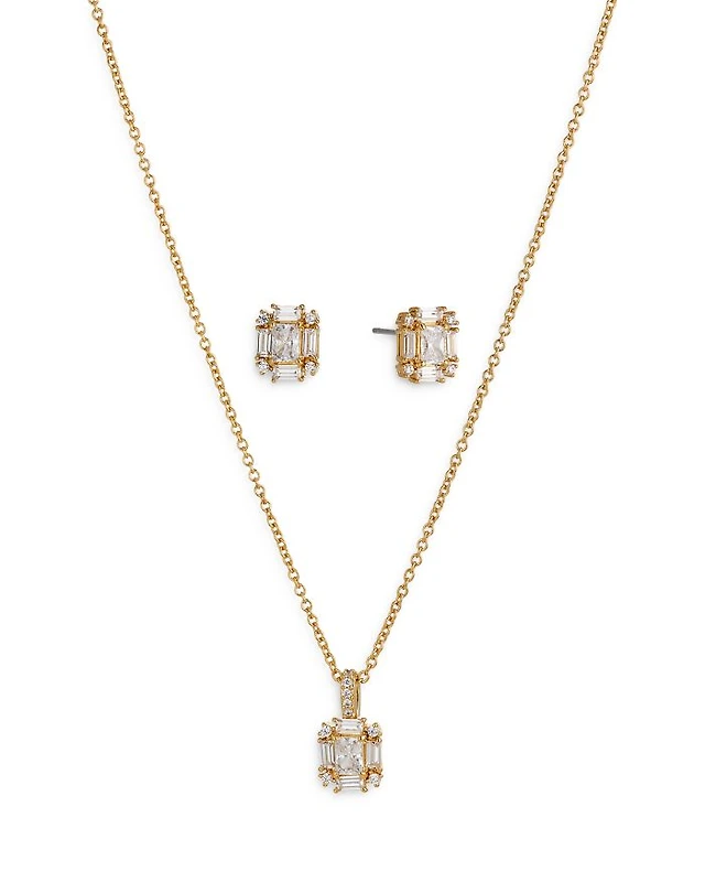 Bridesmaids Emerald Shape Cubic Zirconia Halo Stud Earrings & Pendant Necklace Set