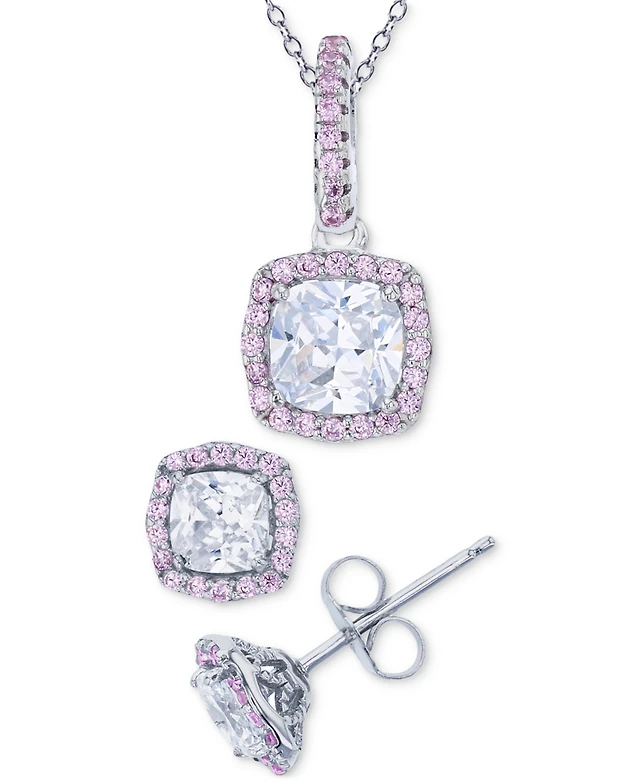 2-Pc. Set White & Pink Cubic Zirconia Square Halo Pendant Necklace & Matching Stud Earrings in Sterling Silver