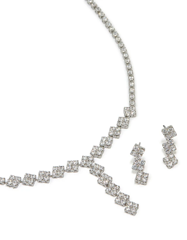 Silver Cubic Zirconia Emerald Cut Necklace & Stud Earrings Set