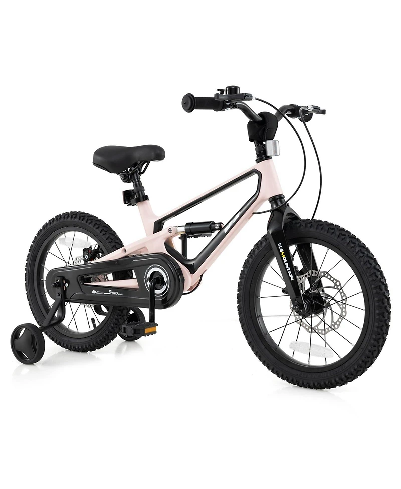 This 16" kids' bike features dual disc brakes, a lightweight magnesium frame, shock absorber, and adjustable parts. With training wheels and 95% pre-assembly, it's ideal for new riders aged 4–7.