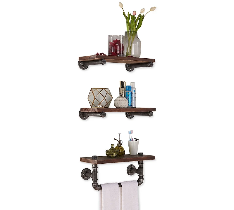 The metal pipe frame and rich-tone wood shelves of this handsome three-piece wall unit present you with a ruggedly charming way to bring industrial-style and functionality to any room, be it a bathroom, kitchen or living space.