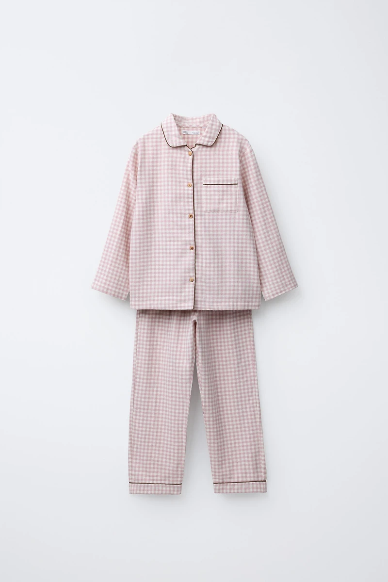 Two-piece pajamas. Shirt with shirt collar and long sleeves. Front button closure. Patch chest pocket with contrasting piping. Pants with elastic waistband and contrasting piping at hem. Gingham print.
