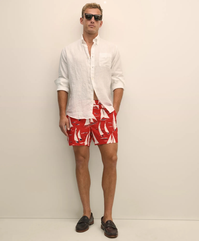 A sailboat print suited for the season. Easily transition from beach to bonfire and back again with our quick-drying trunks in an updated fabrication that features stretch and a comfortable mesh lining.