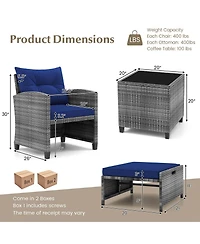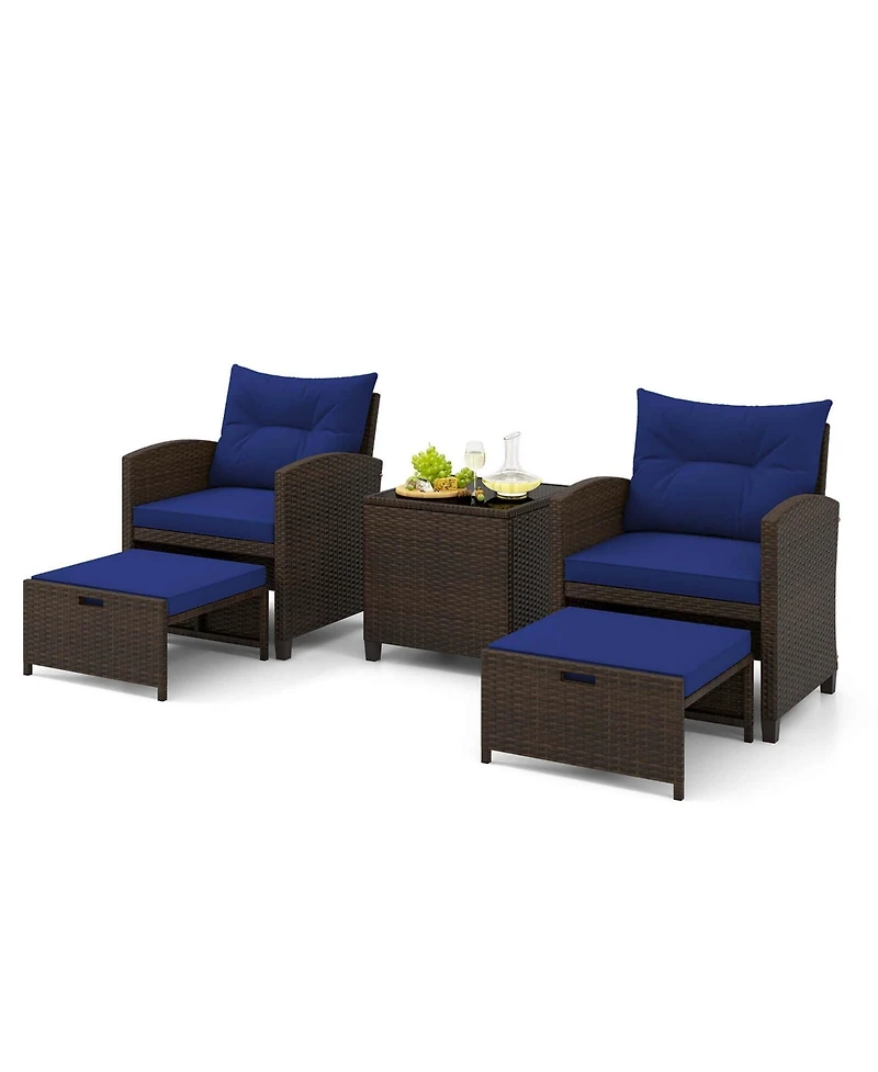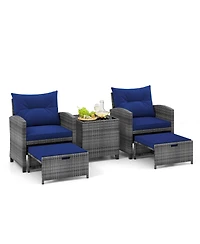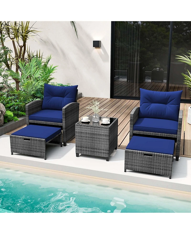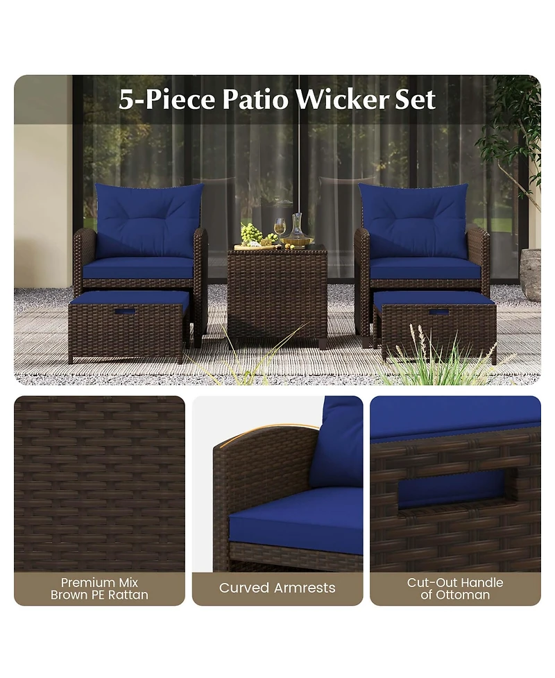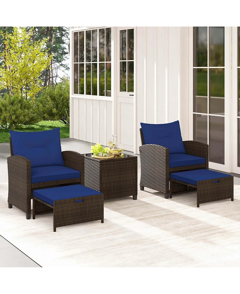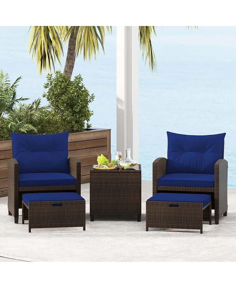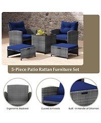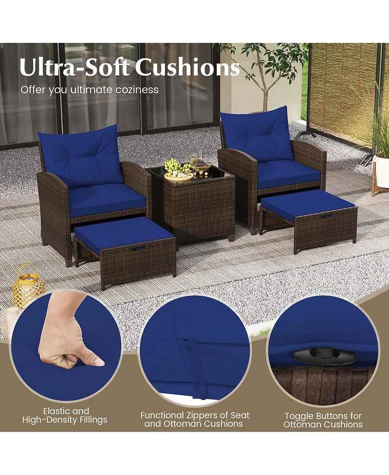 5 Piece Patio Rattan Furniture with 2 Ottomans & Tempered Glass Coffee Table