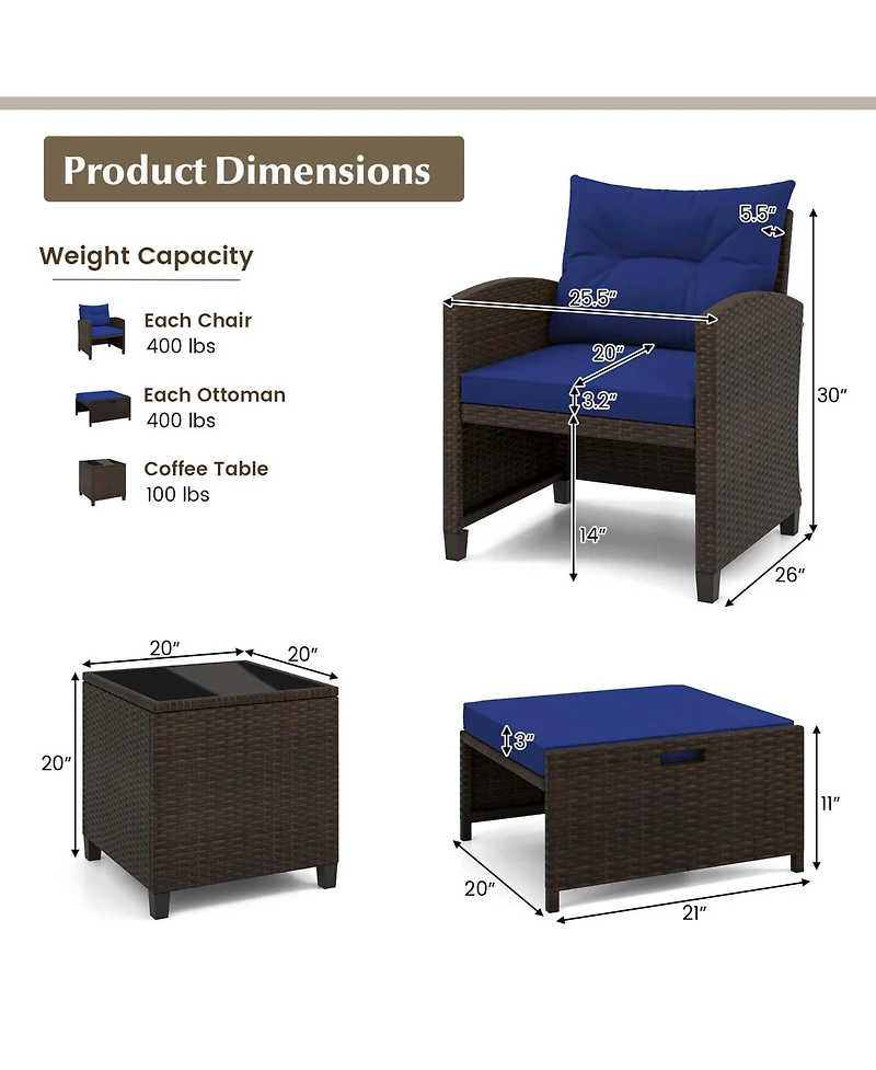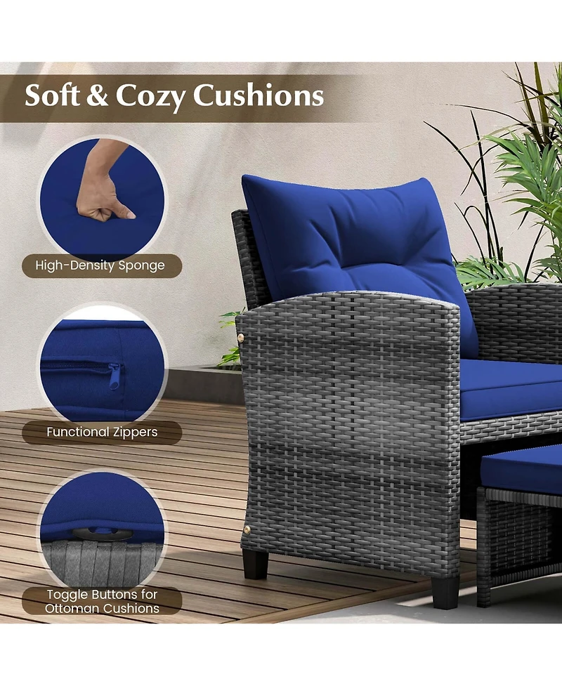 Elevate your outdoor relaxation with this elegant 5-piece patio furniture set. Crafted with built-to-last and fade-resistant Pe rattan, the whole patio set adds a touch of sophistication to any space. And the chairs are comfortable to sit with ergonomic backrest and curved armrests. Moreover, the cushions on the chairs and ottomans bring you more coziness. And the versatile ottomans serve as footrests, extra seats or side tables for more convenience. This 5-piece patio set combines comfort and style, creating an inviting oasis for leisure moments.