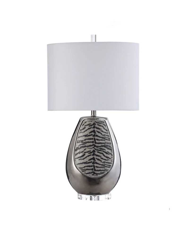 Multiple tones and design elements and makes this table lamp a sight to behold. The teardrop ceramic body is covered in a silver-tone metallic finish, while the inner section of the piece presents a tiger pattern in black and white tones. A classic drum shade in white linen serves as a subtle accent.