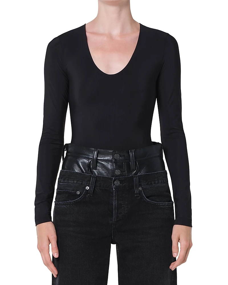 A long-sleeve scoop neck bodysuit by Agolde in a lightweight, second-skin elastane blend. It offers a smooth, ultra-clean fit that layers effortlessly or stands alone. In black, it's a minimalist essential with a modern, sleek edge.