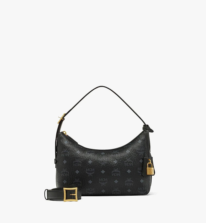 A modern interpretation of the classic slouched silhouette, featuring an ideal balance of softness and structure. The small Aren hobo bag is complemented by elements drawn from heritage MCM luggage, including a detachable leather hang tag and logo-engraved padlock.