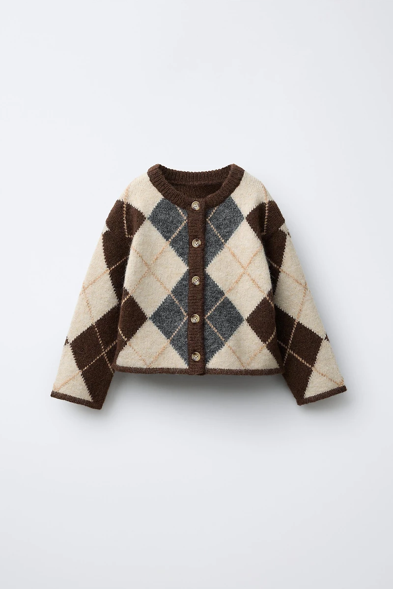 Knit cardigan with a round neck and long sleeves. Button closure at the front. Argyle print.
