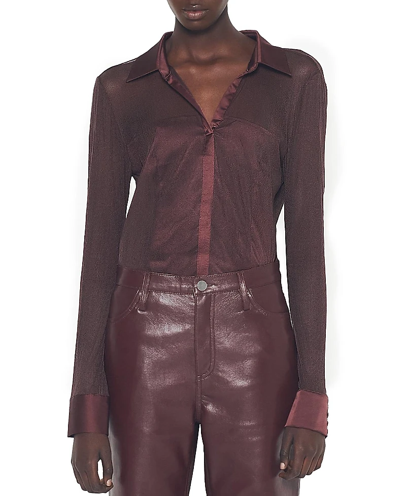 About The Brand:Our stretch silk mesh blouse is a take on a traditional woven blouse. Perfect feminine silhouette that can be worn day-to-night. This beauty is crafted with soft silk mesh all over and lined with stretch satin. Pair with our any Leather Mini Skirt or leather pants for a full look. This top is fitted and is very stretchy. - Our commitment to sustainability: We are plastic free. As by Df packaging is made from 100% recycled materials and is 100% biodegradable.Fit True to size/Runs Fitted Lined Side zip closure Model is 5' 9" and wearing a Us size SFabric Self: 100% Silk Lining: 92% Polyester, 8% SpandexCare Dry clean only