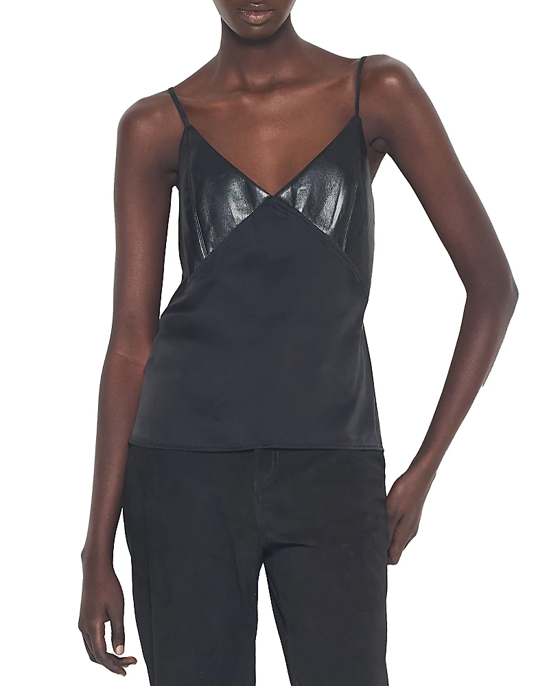 About The Brand:The Ryder Cami is crafted in our luxurious Silk. This camisole features a V-neckline and adjustable delicate straps. There is also an edgy recycled leather overlay on the bust. This style runs fitted. If you are between sizes, we suggest sizing up. Pair this with any leather jacket and the leather mini skirt for a full look.Our commitment to sustainability: We are plastic free. As by Df packaging is made from 100% recycled materials and is 100% biodegradable.Fit Fits True to Size, please choose your normal size Fully lined Adjustable straps V-neckline Model is 5' 9" and wearing a Us size SFabric 100% Viscose Contrast: 52% Leather, 34% Cotton, 10% Polyester, 4% Spandex.Care Dry clean by Leather Professional only
