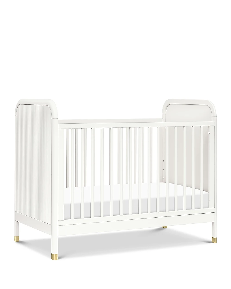 Features The Brimsley Tambour Crib is a masterpiece of craftsmanship that blends timeless design with modern functionality Its distinctive tambour design and gently curved slats, paired with elegant gold-tone feet, make this crib more than just a place for your little one to rest; it's a statement piece that elevates the aesthetic of your nursery Greenguard Gold Certified: This product has been tested for over 10,000 chemical emissions and VOCs, undergoing rigorous scientific testing to meet some of the world's most stringent chemical emissions requirements. It contributes to cleaner indoor air to ensure the health and safety of your family and home 4-in-1 convertibility: Our cribs adapt as your baby grows, even into their teen years. Designed to easily convert to a toddler bed, daybed, and full-sized bed. (toddler bed conversion kit #M19699 and full-size bed conversion kit #M5789 sold separately) Grows with baby: 4 adjustable mattress positions to help transition as your baby grows and develops from newborn to toddler. Easily lower the mattress position as your baby begins to sit, pull up, and stand Quality materials: Materials sourced with your family in mind. This crib is made of solid New Zealand Pine Wood & Tsca compliant engineered wood Multi-step painting process. This product meets or exceeds Astm International and U.s. Cpsc safety standards Thoughtful details: With its textured tambour design, elegant gold-tone feet, and curved panels, Brimsley is a symbol of timeless sophisticationSpecifications Suitable for children up to 50 pounds Compatible with the following (sold separately): Toddler Bed Conversion Kit (M19699); Pure Core Crib Mattress Hybrid Quilted Waterproof Cover 2-Stage; Twin/Full-Size Bed Conversion Kit (M5789) Manufacturer's 1-year warranty