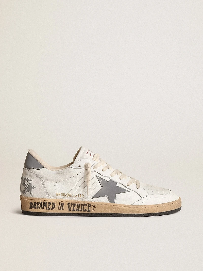 Dreaming of the Eighties. Our Ball Star sneakers have an American college vibe and a feeling of the basketball scene around at the time. This model with a white nappa leather upper features a star and heel tab in gray reflective nylon. The contrasting Dreamed in Venice lettering on the foxing, gray sole and cream-colored laces add the finishing touch: beautiful things that never go out of fashion.