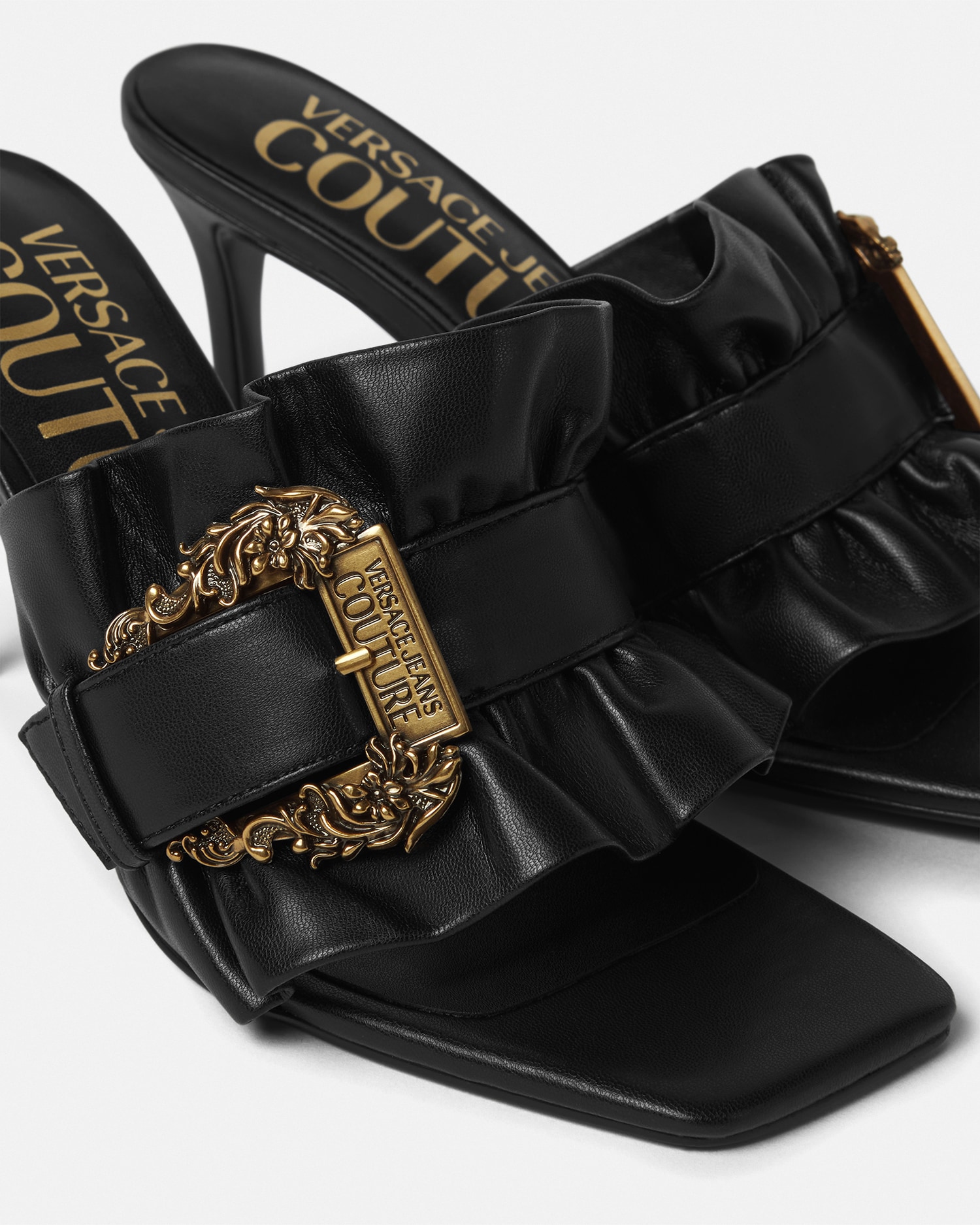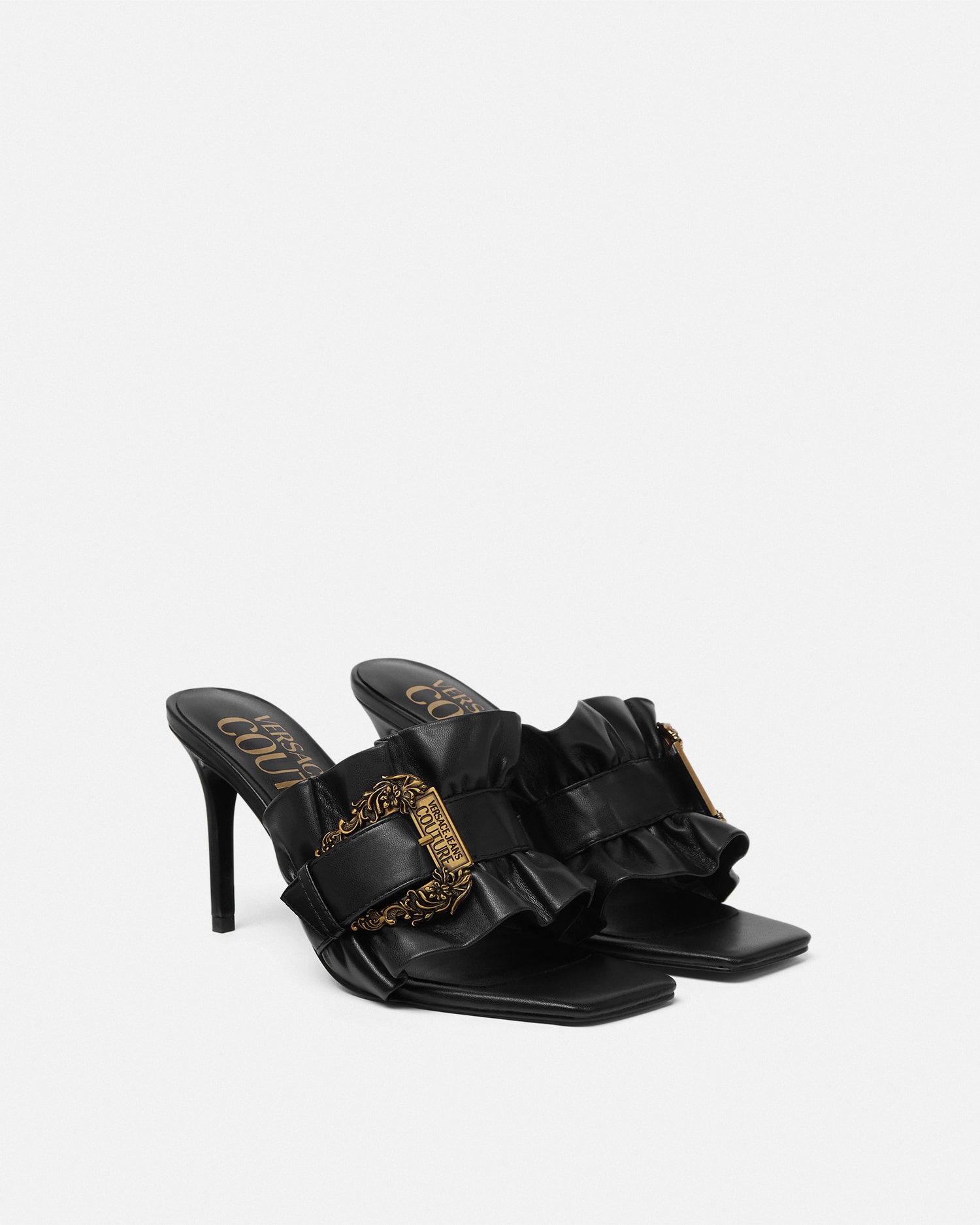 These opentoe mules feature gathered uppers accented by Baroque Buckle straps