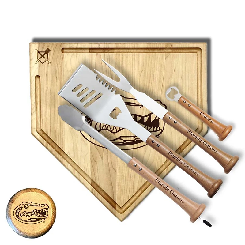 Upgrade your next cookout with this Florida Gators 17" Trough Grand Slam Combo Set from Baseball BBQ. This epic gear features laser-engraved Florida Gators graphics so that the food you prepare for game day will be extra spirited. The tools are made to resemble baseball equipment so that your skills on the diamond can transfer over to the kitchen.